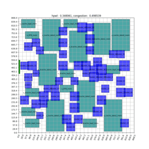 위 애니메이션은 약 1500 iterations 정도의 학습 과정을 보여주고 있습니다. 녹색의 큰 사각형은 Macro, 청색의 작은 사각형은 Standard Cell Cluster를 나타냅니다. 어느 정도 학습이 진행된 후, 사각형의 움직임이 눈에 띄게 줄어들며 안정된 모습을 보여줍니다. 에이전트는 Macro는 Chip Canvas 영역의 바깥쪽, Standard Cell Cluster는 안쪽에 위치시키도록 학습합니다. 위 실험을 하기까지의 과정에 대한 자세한 설명은 본 포스팅을 참고해주세요.
