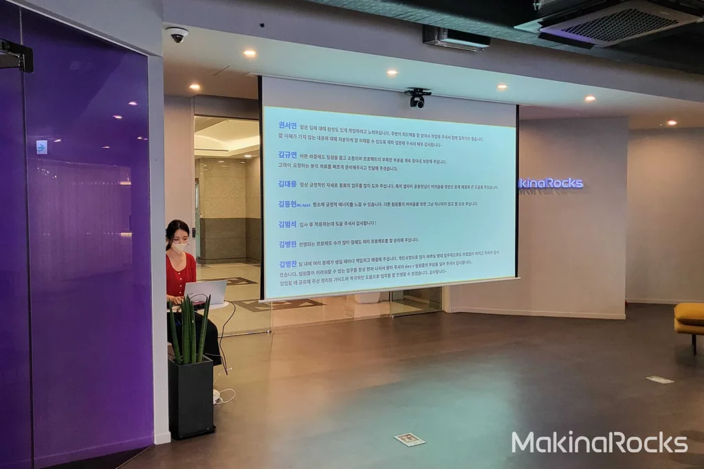 마키나락스에서는 매달 ‘칭찬더하기’ 행사를 통해 칭찬 문화를 만들어가고 있습니다. 이 행사는 지난 해 12월부터 시작이 되었는데요. ‘우리 모두 1년 고생했어요~’라는 느낌으로 덕담 한마디씩 나눴으면 좋겠다고 생각해 시작을 하게 되었습니다. 연말에 구성원들끼리 칭찬을 나누다보니 몽글몽글한(?) 기분이 들더라구요. 서로를 위한 따뜻한 말들이 하나, 둘 더해진다는 의미를 담아 이름은 ‘칭찬더하기’ 로 정했습니다.