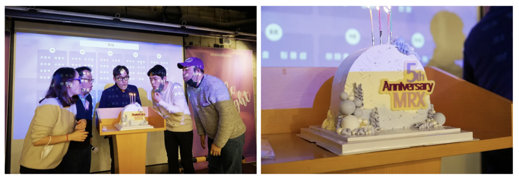 본격적인 행사 시작에 앞서 마키나락스의 5번째 생일 파티를 진행했습니다. 마키나락스의 대표인 재혁님과 성호님, 입사 순번 1등의 영신님, 입사 순번의 중앙값(?)인 선영님, 그리고 가장 최근 입사하신 도후님이 무대에서 직원들을 대표해 함께 우리의 생일을 축하했답니다.