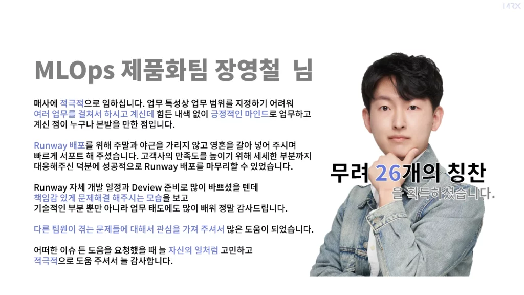 성과 공유회가 끝난 후에는 짧은 캐치업 시간이 있었는데요. 12월 MLOps제품화팀에 새롭게 조인하신 QA 엔지니어 백찬님과 프론트엔드 엔지니어 전도후 님을 소개하는 시간을 갖고 대망의 2022년 칭찬더하기 결산 포상이 진행되었습니다. 팀원들로부터 가장 많은 칭찬을 받은 주인공은 MLOps 엔지니어 영철 님, 그리고 가장 많이 팀원들을 칭찬한 주인공은 MLOps 엔지니어 재연 님이었습니다.