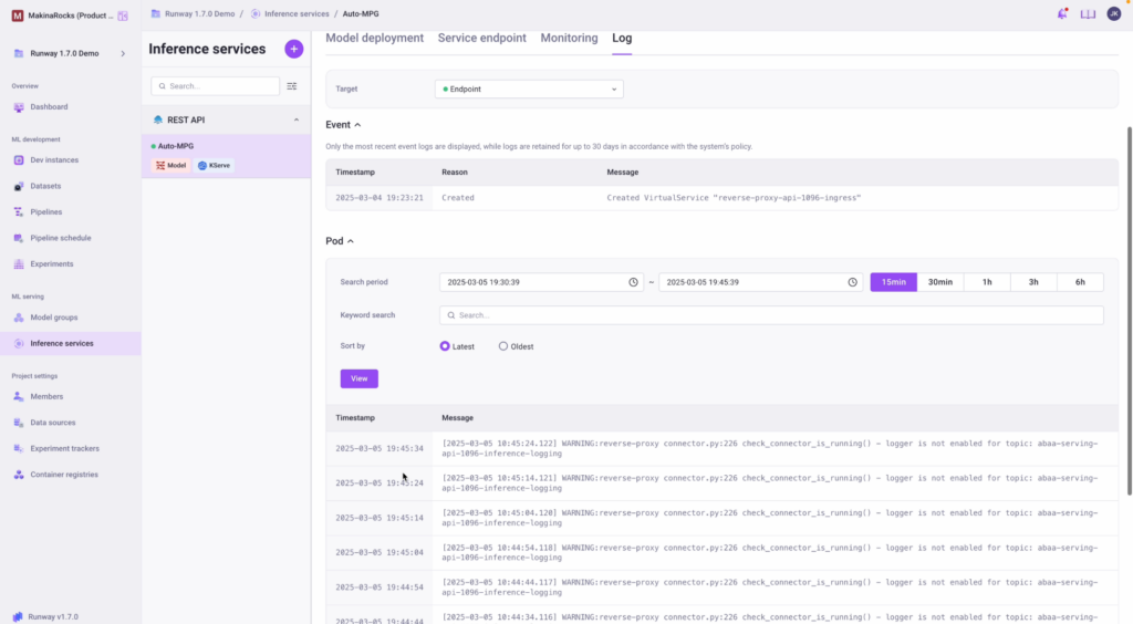 이제 실행 인스턴스의 이벤트 로그와 파드 로그를 실시간으로 조회할 수 있습니다. 개발 환경, 파이프라인 실행, 추론 서비스의 상태를 한눈에 모니터링하고 디버깅하여 운영을 더욱 효율적으로 관리할 수 있습니다. 이벤트 로그를 통해 실행 인스턴스에서 발생한 주요 이벤트(상태 변경, 오류 발생 등)를 추적하고, 파드 로그를 활용해 Kubernetes 컨테이너에서 실행된 작업의 상세 로그를 확인할 수 있습니다. 또한, 필터링, 검색, 정렬 기능을 지원해 필요한 정보를 빠르게 찾아 문제를 신속하게 해결할 수 있습니다.