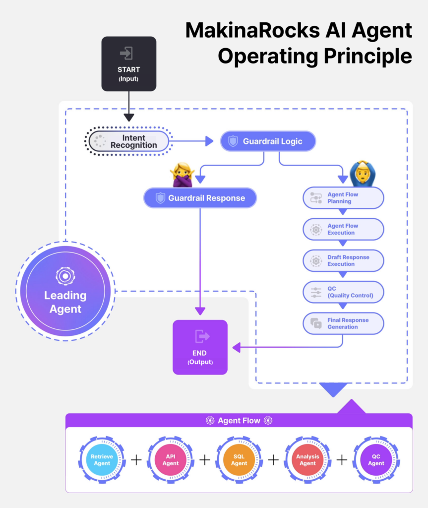 Since 2017, MakinaRocks has applied AI to solve complex, real-world challenges across industries such as manufacturing, automotive, semiconductors, batteries, chemicals, defense, public, and logistics. Our approach goes beyond collecting customer data—we analyze and structure it in real time to reflect the intricacies of each operational environment. On this foundation, we design AI agents purpose-built to tackle specific problems. These agents are not generic data processors. Each is developed as a modular component with clearly defined roles and responsibilities. For example, an API agent triggers external system actions, a DB agent retrieves data from customer databases via natural language queries, and a retrieval agent references manuals or technical documents to recommend the next course of action—serving as a domain-specific reasoning module.