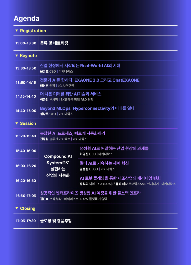 ATTENTION 2024 행사가 종료 되었습니다. 다시보기를 통해 주요 세션을 만나보세요. 관련하여 궁금한 점은 언제든 marketing@makinarocks.ai로 문의해 주세요.