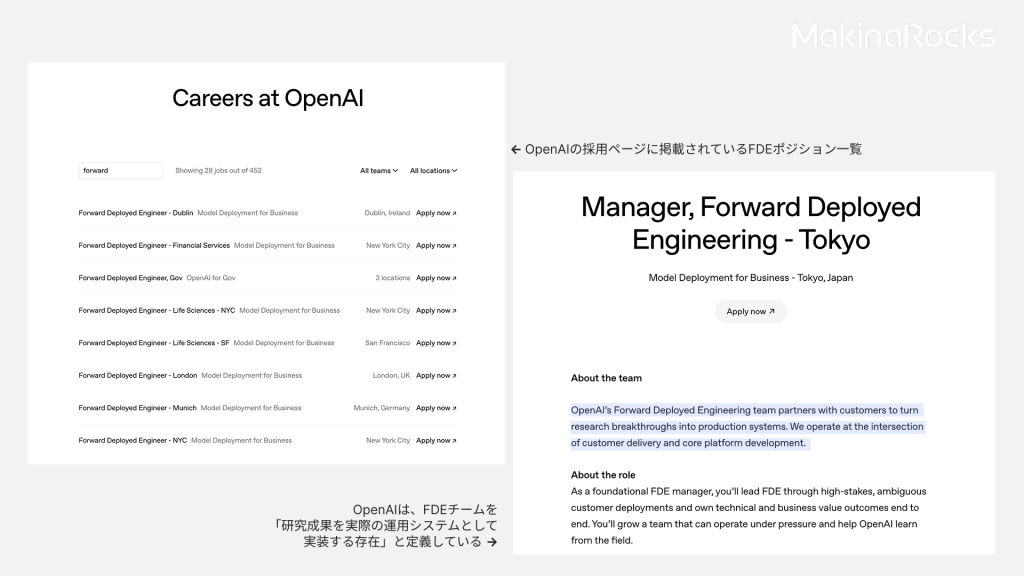 本稿を執筆している現在(2025年12月22日)時点でOpenAI の採用ページを確認すると、ニューヨーク、サンフランシスコをはじめとする米国主要都市に加え、パリ、ミュンヘン、ダブリン、ロンドンといった欧州、さらに東京、シンガポールまで、世界各地で合計28件のFDEポジションが募集されています。特に注目すべき点は、採用要項においてOpenAIがFDEの役割を「研究成果を実際の運用システム(production system)として実装すること」と明確に定義していることです。汎用AIを代表するOpenAIが、FDEを単なる「モデルの引き渡し役」ではなく、「現場でプロダクションを完成させる存在」として位置づけている事実は、AIの勝負どころがどこへ移りつつあるのかを端的に示しています。