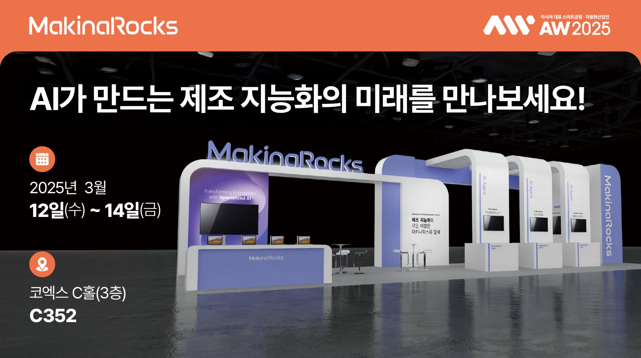 [보도자료 제공일=2025년 2월 26일(수), 서울] 산업 특화 AI 기업 마키나락스(MakinaRocks, 대표 윤성호)가 다음 달 12일(수)부터 14일(금)까지 서울 코엑스에서 열리는 ‘2025 스마트공장·자동화산업전(Smart Factory+Automation World, AW)’에 참가해 제조 생산성을 증강하는 AI 에이전트 기술을 비롯해 다양한 제조 지능화 사례를 선보인다고 26일 밝혔다.