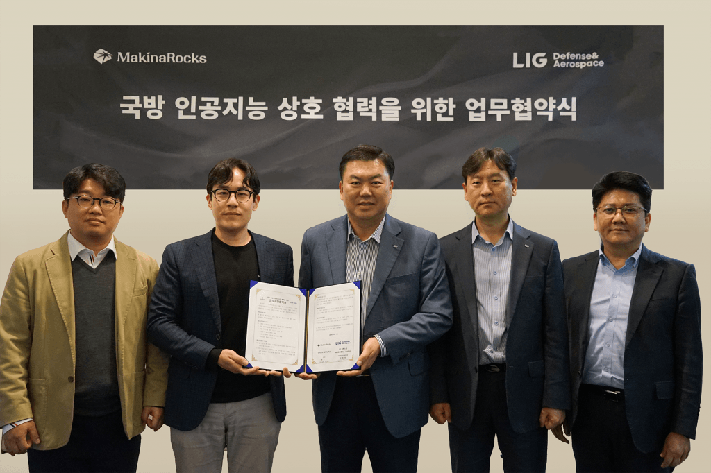 2026년 4월 14일(화), 서울— 피지컬 AI 기업 마키나락스(MakinaRocks, 대표 윤성호)가 LIG 디펜스& 에어로스페이스(이하 LIG D&A, 대표 신익현)와 ‘국방 인공지능(AI) 상호 협력’을 위한 업무제휴협약(MOU)을 체결했다고 14일 밝혔다.