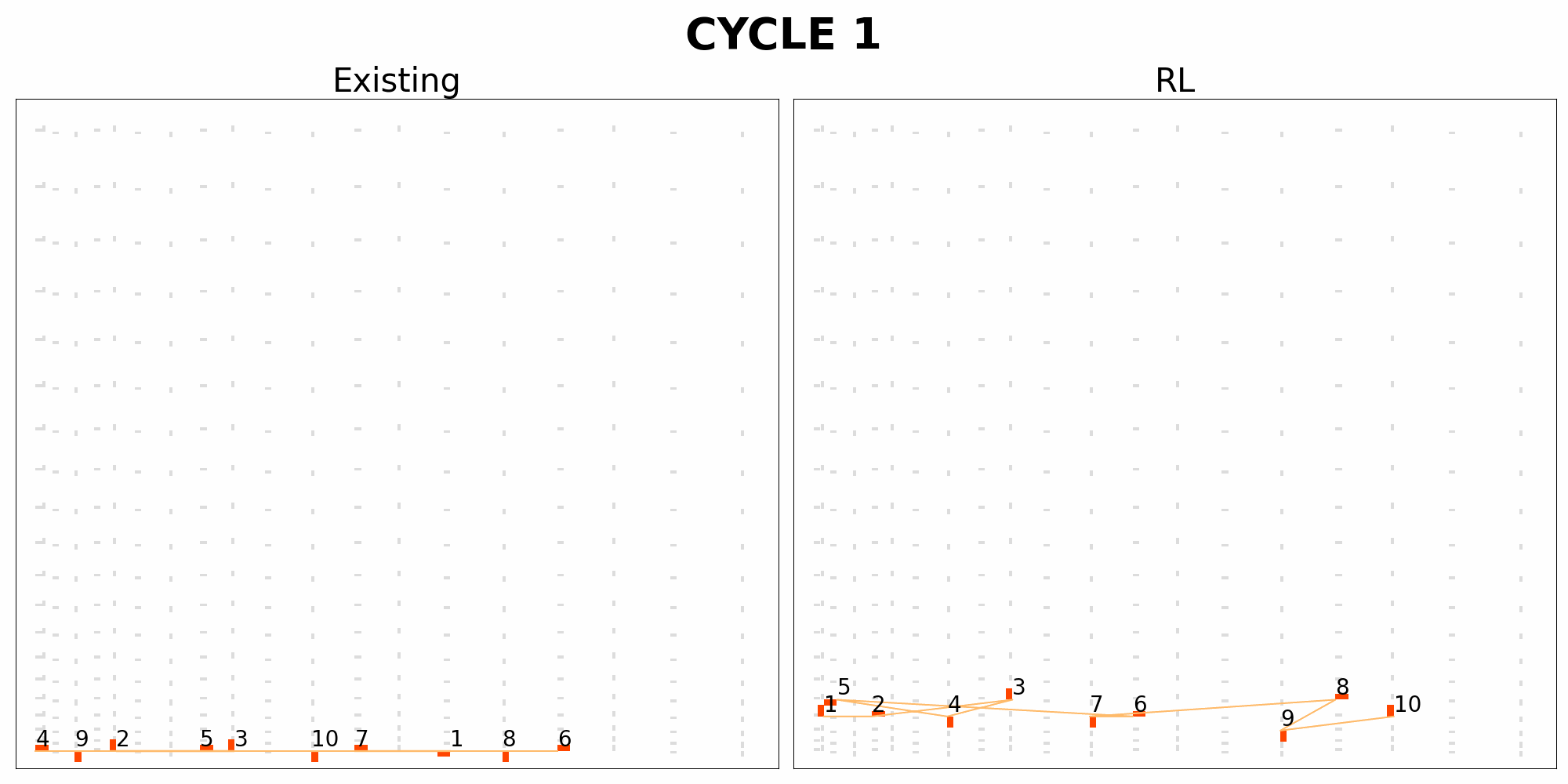 기존 알고리즘과 강화학습이 제시한 mount plan은 head가 10개인 chip mounter를 이용해 수행한다고 가정하고 조립 시간을 측정하였습니다. 즉, 이 chip mounter는 400개의 장착점에 대하여 한 cycle에 10개씩 총 40 cycle에 걸쳐 IPC sample을 조립하게 됩니다. 아래부터 분석하는 결과는 모두 이 chip mounter를 사용한 경우 기존 알고리즘(Existing)과 IPC sample에 대하여 학습한 강화학습 agent (RL)의 결과 입니다.